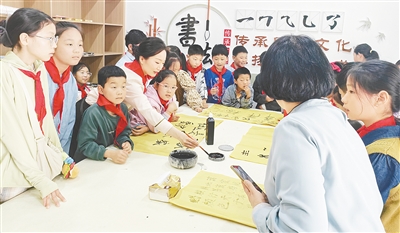 4月21日,郾城区孟庙镇五里庙社居委组织开展“争做新时代好队员——社区是我们共同的家园”主题活动。图为少先队员参观社区书画室。本报记者 张玲玲 摄