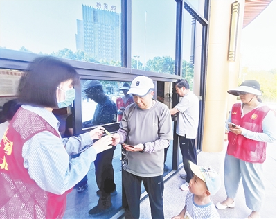 5月14日,郾城区沙北街道嵩山社区志愿者在市人民会堂向预约成功的市民发放食博会门票。
