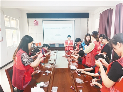 6月3日,郾城区许洼小学少先队员代表到岷山路社区,与工作人员一起制作香囊。沈一娜 摄