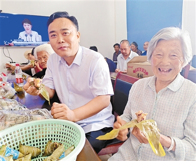 6月7日,舞阳县莲花镇小赵村81岁老人田银婉开心地吃着驻村第一书记宋涛送来的粽子。当天,宋涛为该村60岁以上老人购买了粽子。 本报记者 杨东辉 摄