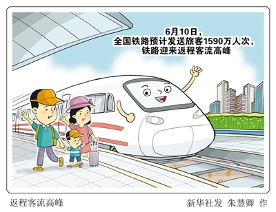 记者从中国国家铁路集团有限公司获悉,6月10日,全国铁路预计发送旅客1590万人次,计划加开旅客列车1071列,铁路迎来返程客流高峰。6月9日,全国铁路发送旅客1249.1万人次,铁路运输安全平稳有序。 新华社发 朱慧卿 作