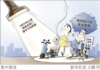 检查违规回收、二次组装蓄电池的黑作坊1家,查扣非法改装及制假售假窝点的非法改装车辆7辆和非法改装电池10块……5月23日以来,海南省各级消防、公安、市场监管、住建、综合执法等部门联合开展了多次电动自行车安全隐患集中夜查行动,查处了一批违法违规行为。 新华社发 王 鹏 作