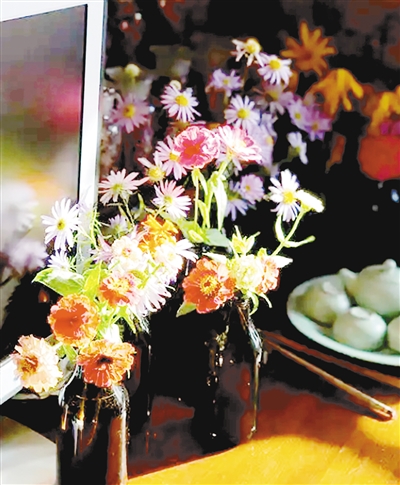 酒瓶插花,选取什么样的花材是有讲究的。若瓶圆且矮,选择百合之类直立的花就衬托不出其亭亭玉立,适合选择倾斜或下垂的枝条。我家楼下有棵石榴树,折回一小枝有花带果的飘逸枝条,剔除影响观感的枝叶,往酒瓶里加入适量清水,插入石榴枝,调整角度,一幅意境深远的水墨画就出现在面前。