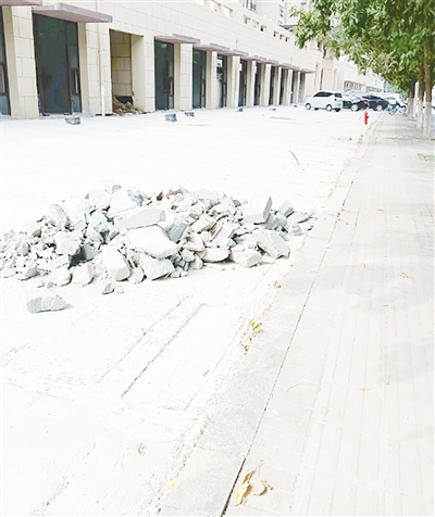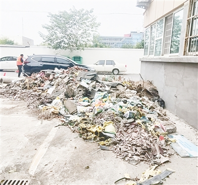 人民路与金山路交叉口向东约60米路南,外贸家属院4号楼前垃圾渣土未及时清理。