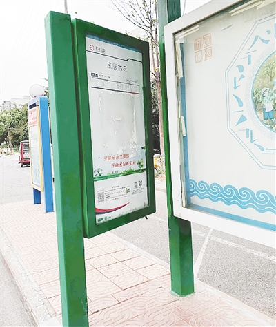 燕山路与漓江路交叉口向南约60米路西,公交站亭破损。
