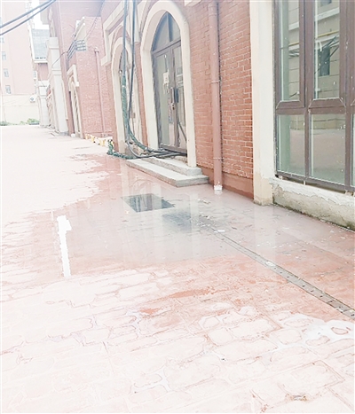 柳江路与五一路交叉口向东约120米路南,信阳生态茶场门店南侧排水管道堵塞,污水横流。