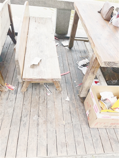 十月六日,漯湾古镇,垃圾散落在地面和凳子上。
