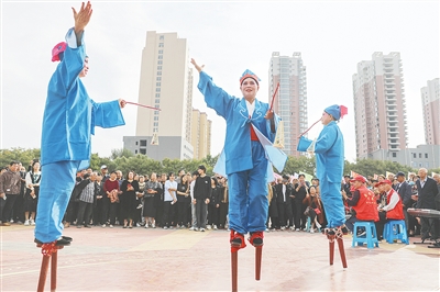 10月10日,艺人在宝丰县新世纪广场表演高腿曲子戏。