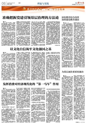 党的二十届三中全会指出,“加强党建引领基层治理”。习近平总书记强调,要扎实推进党建引领基层治理。在进一步全面深化改革的伟大征程上,要准确把握党建引领基层治理的方法论,以创新之策、硬核之力、恒久之功强化治理共识、优化治理格局、深化治理变革,不断把学习宣传贯彻党的二十届三中全会精神引向深入,把中国特色基层治理的改革实践推向纵深。