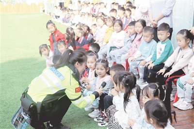 10月15日,临颍县公安局交通警察大队铁骑中队走进临颍县金色摇篮幼儿园四分园开展交通安全知识宣讲。张亚平 摄