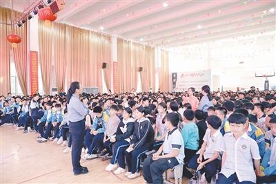 10月14日,临颍县人民检察院检察官卢静和志愿者走进临颍县颍川学校,以“拒绝校园欺凌 远离犯罪陷阱”为主题,为七年级1000余名师生送上了一堂别开生面的法治课。王瑞苗 摄
