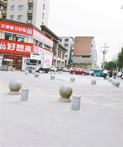 交通北路与黄河中路交叉口向北约100米路东,门面房前,隔离墩乱堆放。