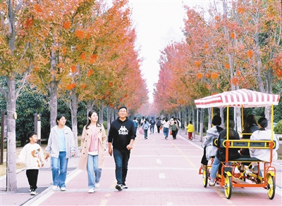 10月27日,市民在沙澧河风景区游玩。近期,沙澧河风景区的红枫进入最佳观赏期,吸引不少市民前来观赏和拍照。本报记者 范子恒 摄