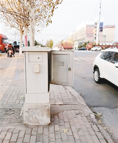 井冈山北路与龙江西路交叉口向南约10米路西,人行道上交通信号设施箱箱门未关。