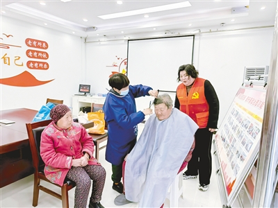1月6日,源汇区顺河街街道东大街社区联合漯河市康养投生活服务有限公司开展“‘浴’见温暖 情暖夕阳”老年人爱心助浴活动。图为老人洗浴前,志愿者为其理发。本报记者 孙 震 摄