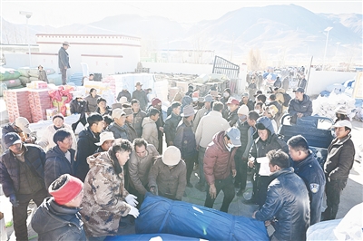 上图 1月9日,受灾群众在措布村村委会领取救灾物资。 新华社记者 李 响 摄