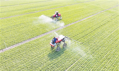 2月18日,在安徽省亳州市谯城区赵桥乡一处麦田,农民驾驶农机开展田间管理(无人机照片)。