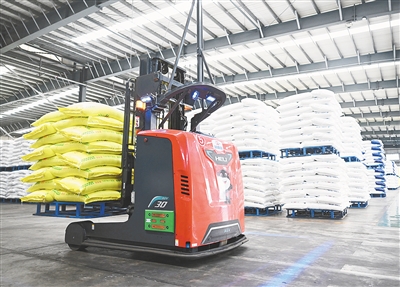↑ 2月26日,河南心连心化学工业集团成品库内的AGV叉车在装运化肥成品。