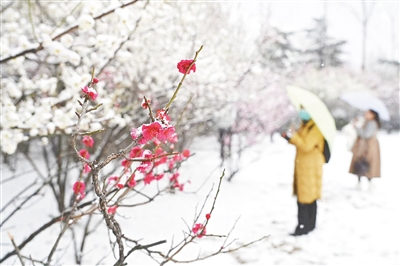 上图 3月3日,我市普降大雪。市民走进沙澧河风景区踏雪赏梅。