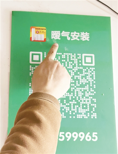 3月18日,记者赶到银河湾小区,看到多个楼道里贴着“暧气安装”二维码(如图)。采访中,小区多名居民坦言,虽然每天上下楼都经过这里,但谁也没注意到二维码的文字说明错了。