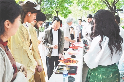 应留学生们的请求,陶秋阳和谢军伟在团扇、红纸上写下励志箴言,或者他们喜欢的字。大家纷纷表示,要好好珍藏这些书法作品,带回国送给亲人。