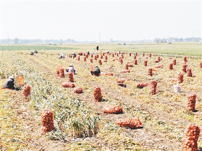 5月12日,临颍县陈庄乡伙邵赵村的蒜农在收获大蒜。