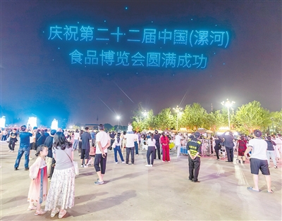 左图 5月18日晚上,千机飞“只有漯河”无人机表演食博会专场在沙澧河交汇处举行。上千架无人机组成不同团案,庆祝食博会成功举办。