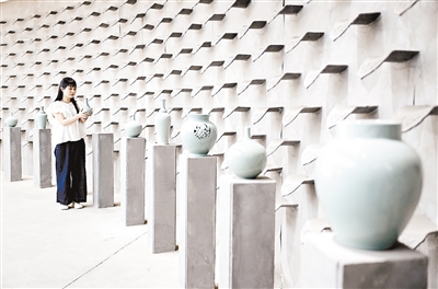 日前,宝丰县一家汝瓷企业的工作人员在整理展厅内的汝瓷产品。