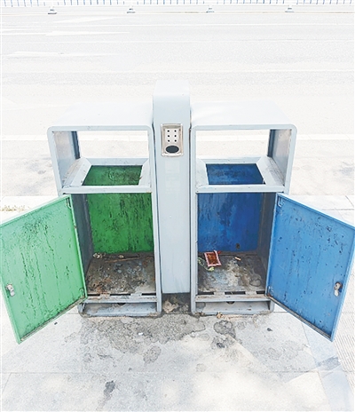 文化路与建设路交叉口向北约30米路西,垃圾箱内胆缺失。