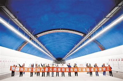 据介绍,该隧道全长1551米,双向双洞8车道,最大开挖跨度31.8米,最大开挖断面447.62平方米,是我国目前最大跨度断面市政交通隧道。