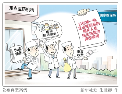 国家医保局日前公布了第一批定点医药机构相关人员违法违规的典型案例,涉及伪造病历、虚构医药服务、重复收费等违法违规行为。这是医保支付资格管理制度落实以来首次对外公开的典型案例。新华社发 朱慧卿 作