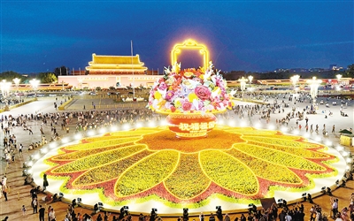 9月25日在天安门广场拍摄的“祝福祖国”大花篮夜景。
