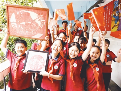 九月二十六日,在四川省达州市开江县西城小学,小学生展示制作的“祝福祖国”创意剪纸作品。新华社发(邓良奎 摄)