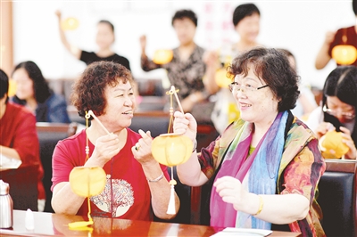 九月二十六日,在山东省青岛市崂山区金家岭街道钟家沟社区开展的迎“双节”主题活动上,居民展示“柿柿如意”花灯。新华社发(王海滨 摄)
