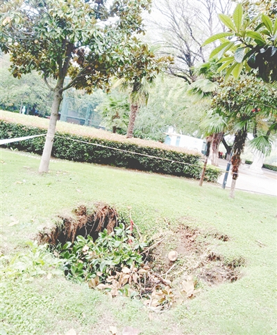 沙河南堤与五一路交叉口向西约5米路北,绿地内有坑洞。