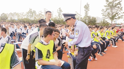 9月25日,王妙丽禁毒宣传志愿服务工作室、郾城区司法局、郾城区教育局、郾城区法学会组织人员到郾城中学开展禁毒法治宣传。图为民警拿出伪装成奶茶、糖果的新型毒品仿真模型,教学生如何辨别。李留芳 摄