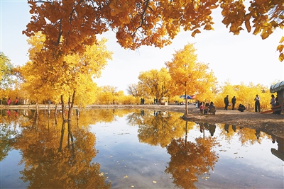 10月14日,游客在甘肃省敦煌市黄渠镇的胡杨林中游览。
