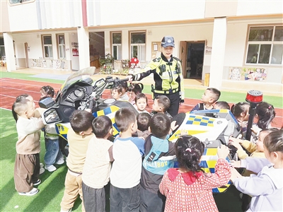 近日,市直幼儿园开展了家长进课堂活动,邀请交通骑警为孩子们带来了一场别开生面、精彩纷呈的安全知识课。师 豫 摄