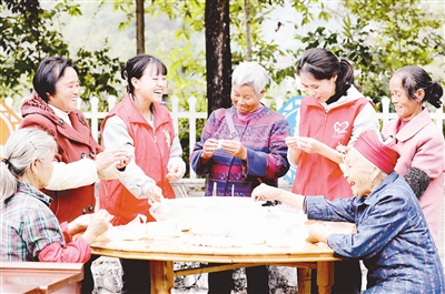 10月27日,在贵州省黔东南苗族侗族自治州施秉县甘溪乡高碑村举办的“情暖重阳·敬老情长”活动中,志愿者与老人们一起包饺子。新华社发(邰胜智 摄)