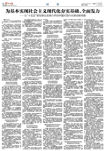 全会通过的“十五五”规划建议,准确把握“十五五”时期在基本实现社会主义现代化进程中的重要地位,对“十五五”时期我国经济社会发展作出系统谋划和战略部署,为乘势而上、接续推进中国式现代化建设擘画宏伟蓝图、指明前进方向。