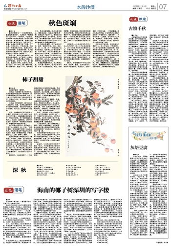 如今,柿子早已不是鲜物。秋季,这棵柿树枝头依然挂满了柿子。从树下经过,柿香便会扑鼻而入。抬头望去,柿子在阳光的照耀下和叶片的反衬下,显得光亮、丰满。自然成熟的柿子颜色格外深红,迎着阳光,仿佛能看见它的心脏、汁液,甚至内部的脉络。