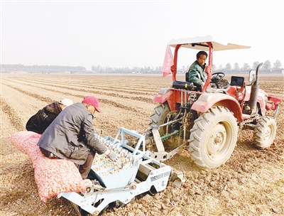 11月3日,郾城区孟庙镇西营村一大蒜种植基地,村民正使用大蒜播种机种植大蒜。本报记者 范子恒 摄