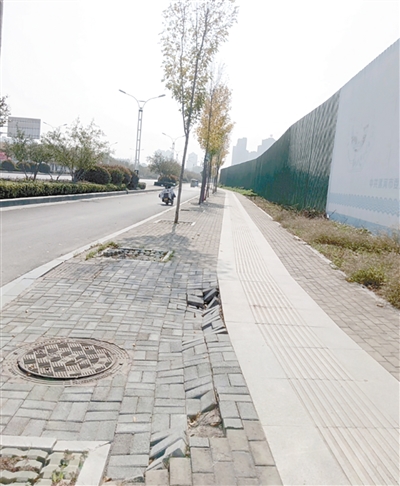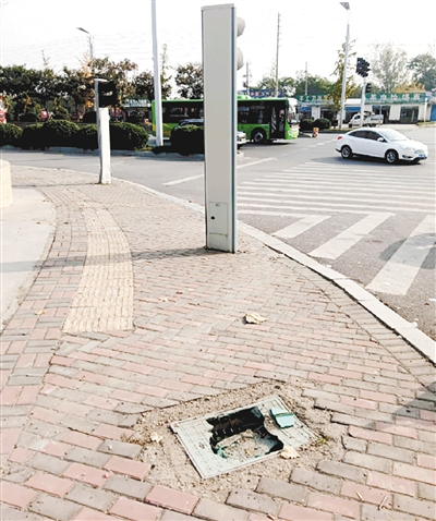 龙江路与许慎路交叉口东北角,人行道井盖破损。