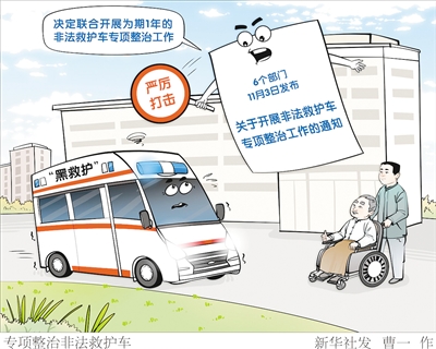 开展医疗卫生机构救护车清查、严厉打击“黑救护”等违法违规行为、疏堵结合引导医疗照护转运服务良性发展……国家卫生健康委、公安部等6个部门11月3日发布通知,决定联合开展为期1年的非法救护车专项整治工作。新华社发
