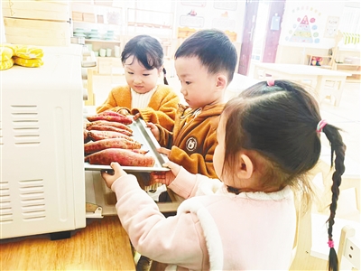 ② 11月7日,郾城区实验幼儿园开展以“冬启新序 食暖童心”为主题的立冬节气食育活动。图为小班幼儿体验烤红薯。胡 东 摄
