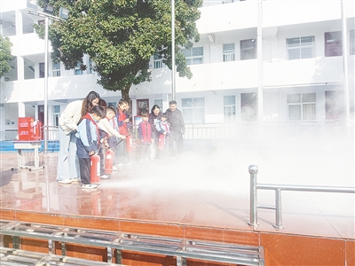 11月5日上午,郾城区东街小学开展校园安全疏散演练。图为该校学生在教师的指导下操作灭火器。赵世杰 摄