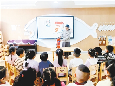 ↑近日,郾城区太行山路幼儿园开展了一系列消防安全教育活动。图为老师介绍灭火器的用途和使用方法。刘红爽 摄
