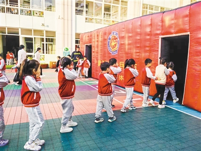 ←11月5日,漯河市实验幼儿园联合郾城区消防救援大队、沙北派出所,开展了“119”消防安全进校园暨消防安全应急疏散演练活动。图为孩子们进入消防逃生体验屋。贾婉霞 摄
