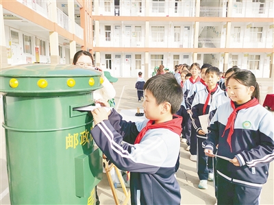 11月14日上午,中国邮政集团有限公司河南省漯河市郊区分公司向郾城区向阳小学授予“雷锋少年邮局”牌匾,并向10名学生“小员工”颁发聘书。图为同学们将加盖雷锋纪念邮戳的信件和明信片投入邮筒。本报记者 范子恒 摄