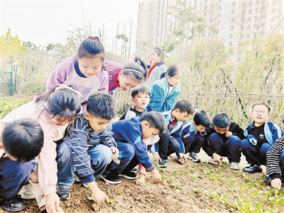 → 近日,郾城区太行山路小学三年级学生跟随班主任走进学校劳动实践基地,了解蔬菜的生长过程。翟 甜 摄
